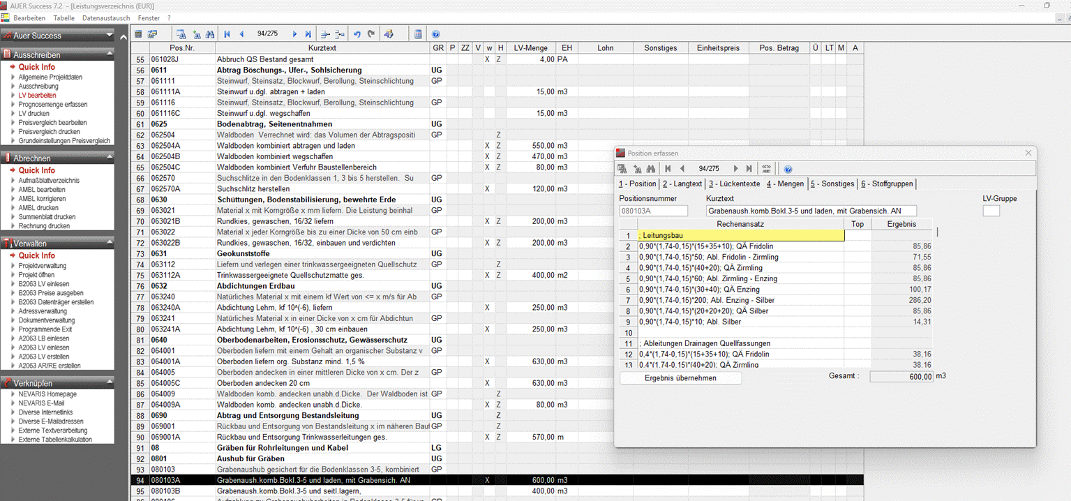Ist es möglich beim Success X die Mengenberechnung im Leistungsverzeichnis in einem separatem Fenster zu öffnen, wie das bei AUER Success möglich war (siehe screenshot) bzw. wäre es wünschenswert dies nach zu programmieren, um die Übersichtlichkeit und Effizienz zu steigern. Mit der aktuellen “kombinierten” Variante werden die Bereich der Positionen und der Mengenberechnung beide größenmäßig sehr eingeschränkt.